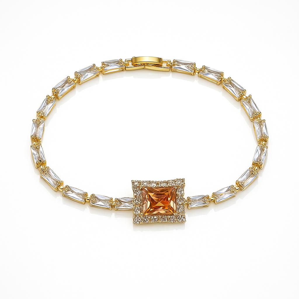 The Amber Crown bracelet radiates golden opulence with a centerpiece that commands attention — a 9 × 9 mm princess-cut amber cubic zirconia stone, framed in a halo of 1.5 mm round-cut white stones. The band is lined with shimmering 4 × 2 mm tapered baguette-cut white cubic zirconia, all beautifully set in high-polish gold-tone stainless steel. This elegant design blends warmth, clarity, and structure, offering a timeless yet luxurious look, complete with anti-tarnish finish and a secure clasp for lasting brilliance.