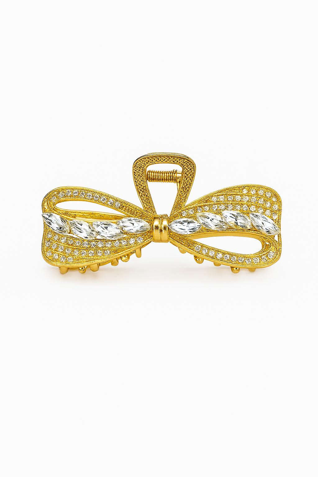 Add a graceful sparkle to your hairstyle with the Crystal Bow Hair Claw Clip, crafted in an elegant bow silhouette. This spring claw-style clip features a golden frame embellished with fine pavé crystals and a centerpiece of dazzling leaf-cut cubic zirconia stones. Designed for a secure hold and a refined finish, it’s the perfect blend of sophistication and charm for both everyday glamour and special occasions.