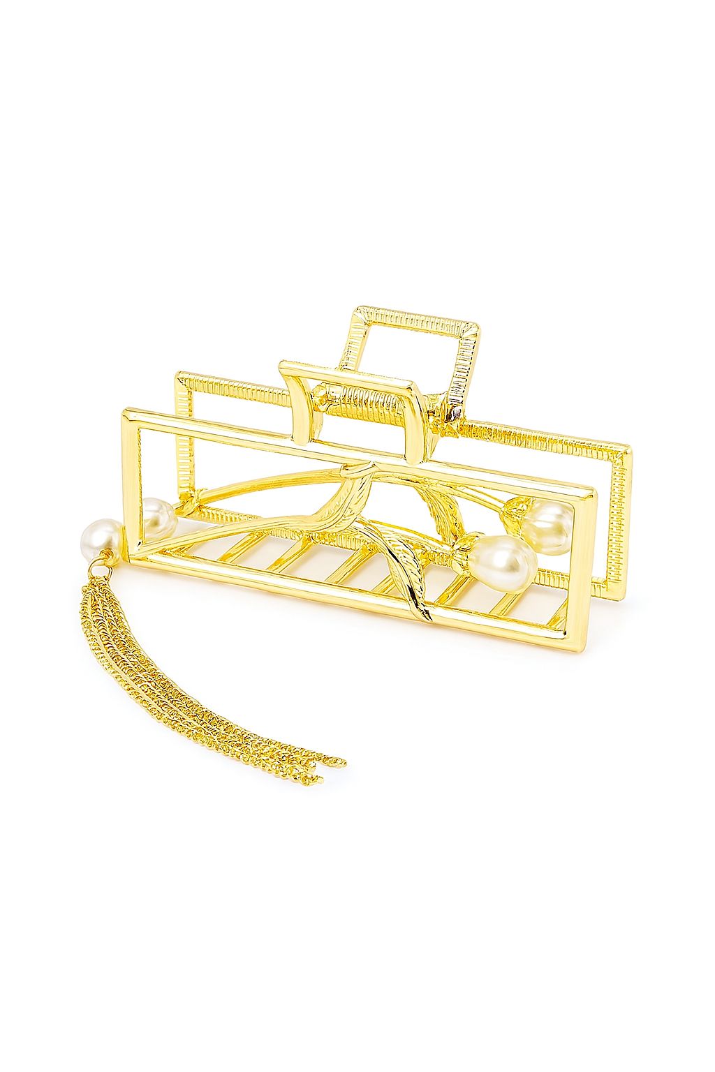 Introducing the Golden Drape Charm Hair Claw Clip, a modern masterpiece crafted in an open rectangular gold frame, accented with delicate pearl buds and an elegant tassel chain charm that dances with your every move. This unique open-frame claw clip features a botanical leaf design and adds a glamorous twist with its swinging gold chains and creamy pearl details. Perfect for securing loose buns or half-up styles, this claw clip blends minimal elegance with dramatic flair. A statement piece for those who love subtle extravagance.