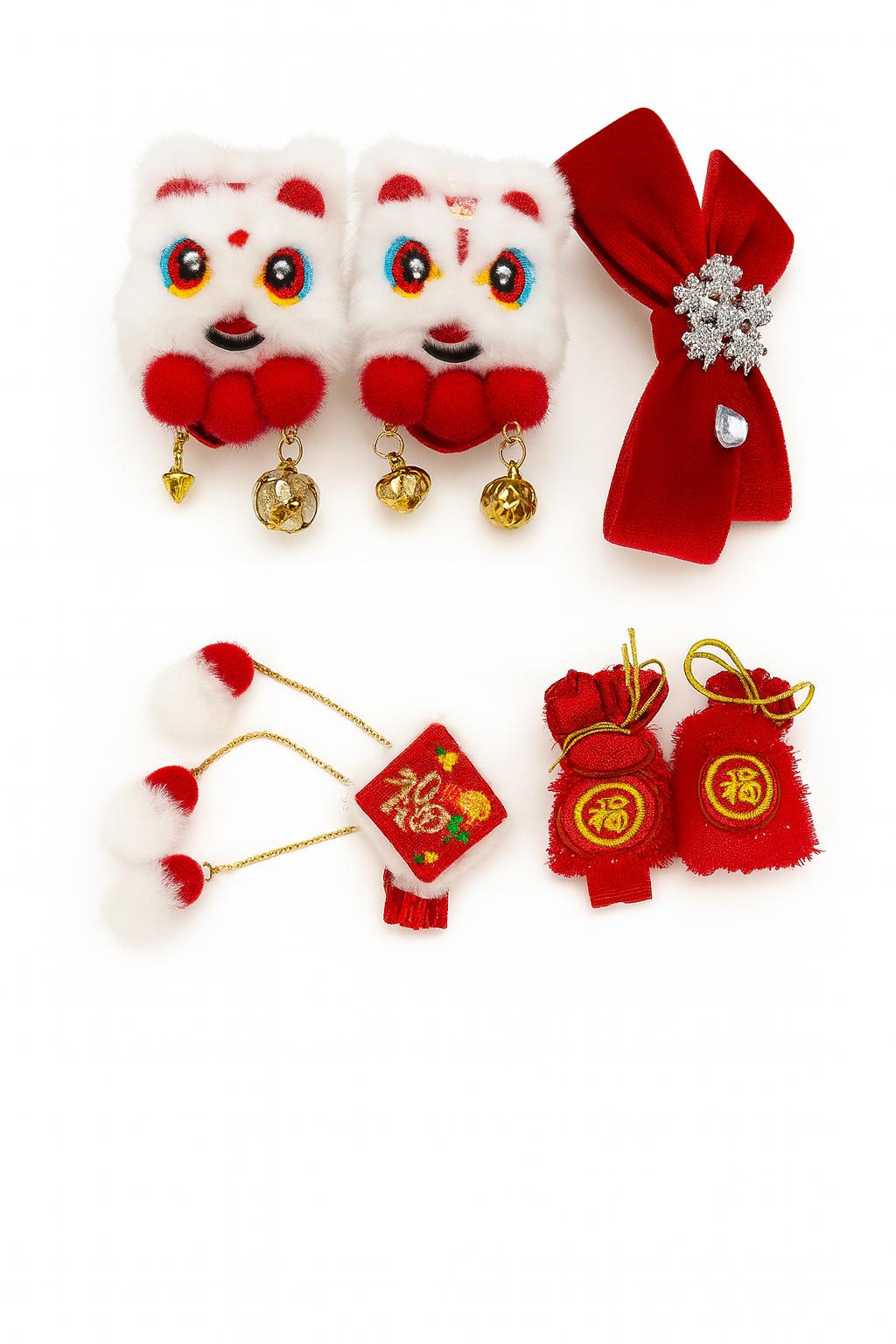 Lucky Lunar Set – 7-Piece Hair Pins Set with Furry Lion Clips, Red Bow Hair Clip, Dangle Pom-Pom Pins, and Festive Charm Accessories
