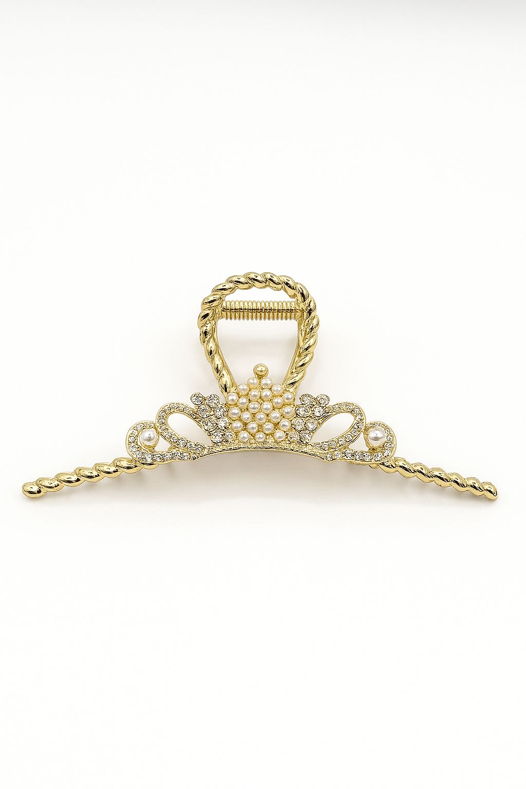 Step into your royal moment with the Regal Grace Pearl Tiara Crown Claw Clip, a majestic blend of elegance and charm. Shaped like a tiara, this claw clip features a crown centerpiece adorned with luminous faux pearls and glittering crystals, framed by intricate floral accents and a twisted rope handle. Finished in radiant gold-tone, it offers both secure hold and royal glamour. Perfect for weddings, formal occasions, or when you simply want to feel like a queen.