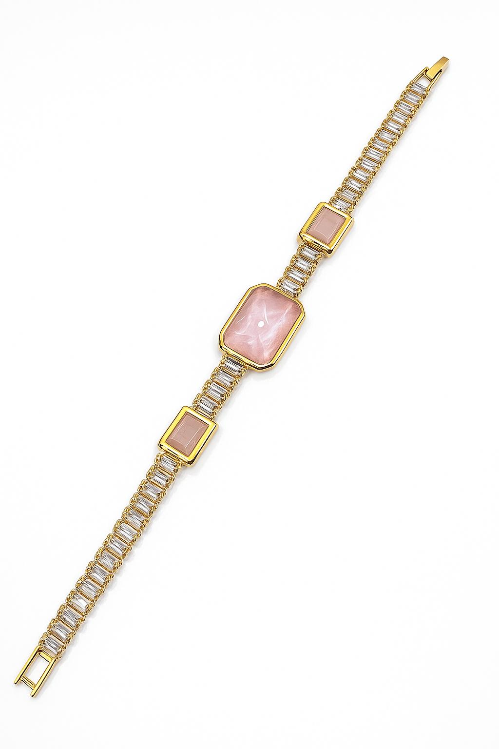 Elevate your elegance with the Rose Lux tennis bracelet – a radiant blend of modern design and soft sophistication. At the center rests a 10mm square-cut blush stone, framed in luminous gold-tone stainless steel, drawing the eye with its refined symmetry. Two 6mm rectangular-cut stones accent the sides, while the bracelet’s band shimmers with a sleek line of baguette-cut white cubic zirconia. Crafted for refined beauty, this piece offers a timeless silhouette with a contemporary glow.