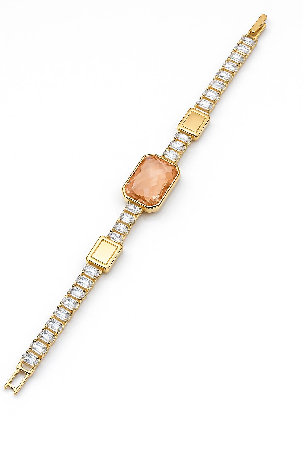 Glowing with golden warmth, the Soleia Dusk tennis bracelet brings a radiant balance of boldness and elegance. At its center lies a 10mm emerald-cut peach-toned stone, flanked by two 6mm rectangular accents, all set in rich gold-tone stainless steel. The bracelet’s band sparkles with precisely aligned baguette-cut white cubic zirconia, creating a refined linear brilliance. Finished with anti-tarnish polish, this piece is a luminous ode to sunset hues and structured sophistication.